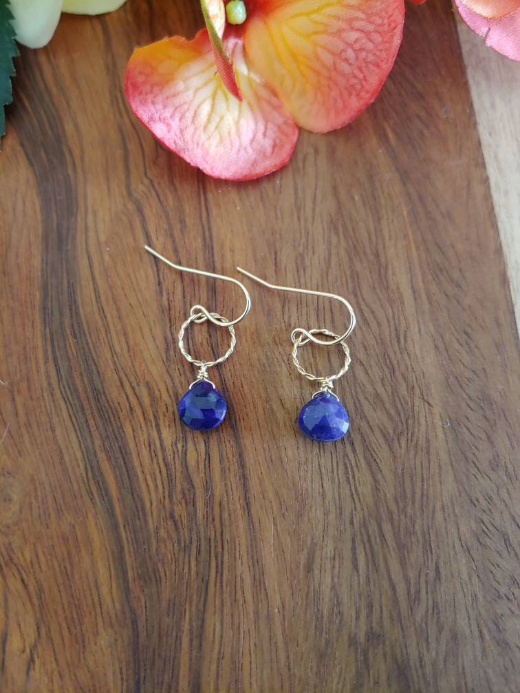 Lapis earrings on twisted ring. Gold filled or Sterling silver avail. AAA quality lapis gemstones are faceted and are stunning! These earrings dangle 1 inch from earlobe