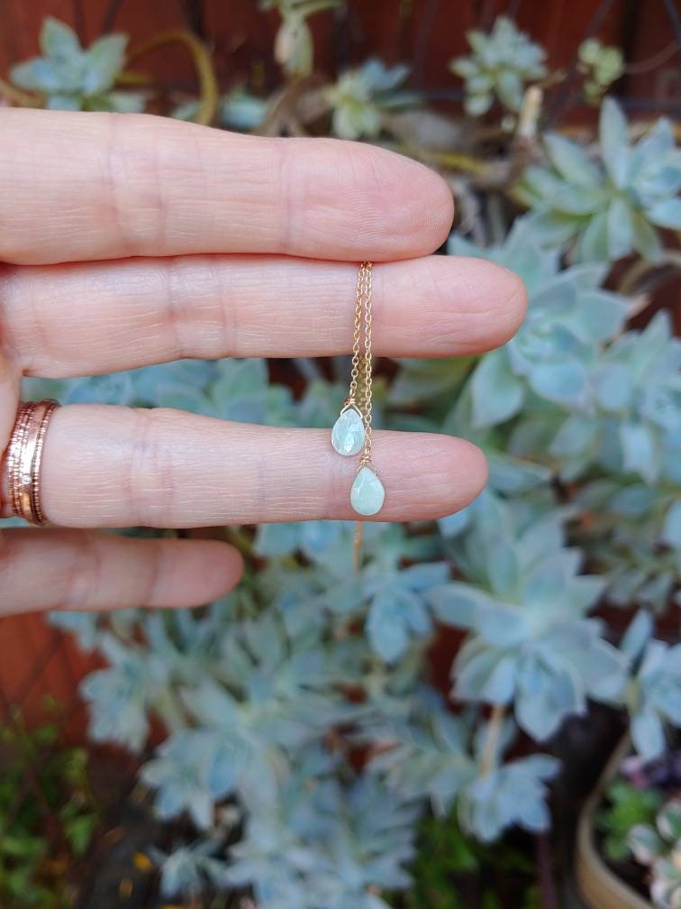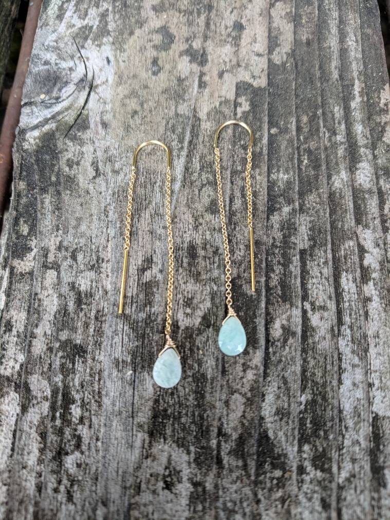 Gold amazonite threader earrings dangle approx 3 inches from earlobe. Want shorter? Let me know. These Amazonite gemstones are approx 4mm and have beautiful soft hues of blue. Have a special request? Ask me
