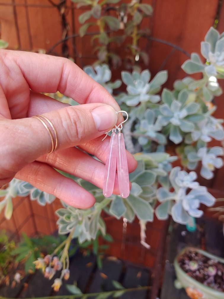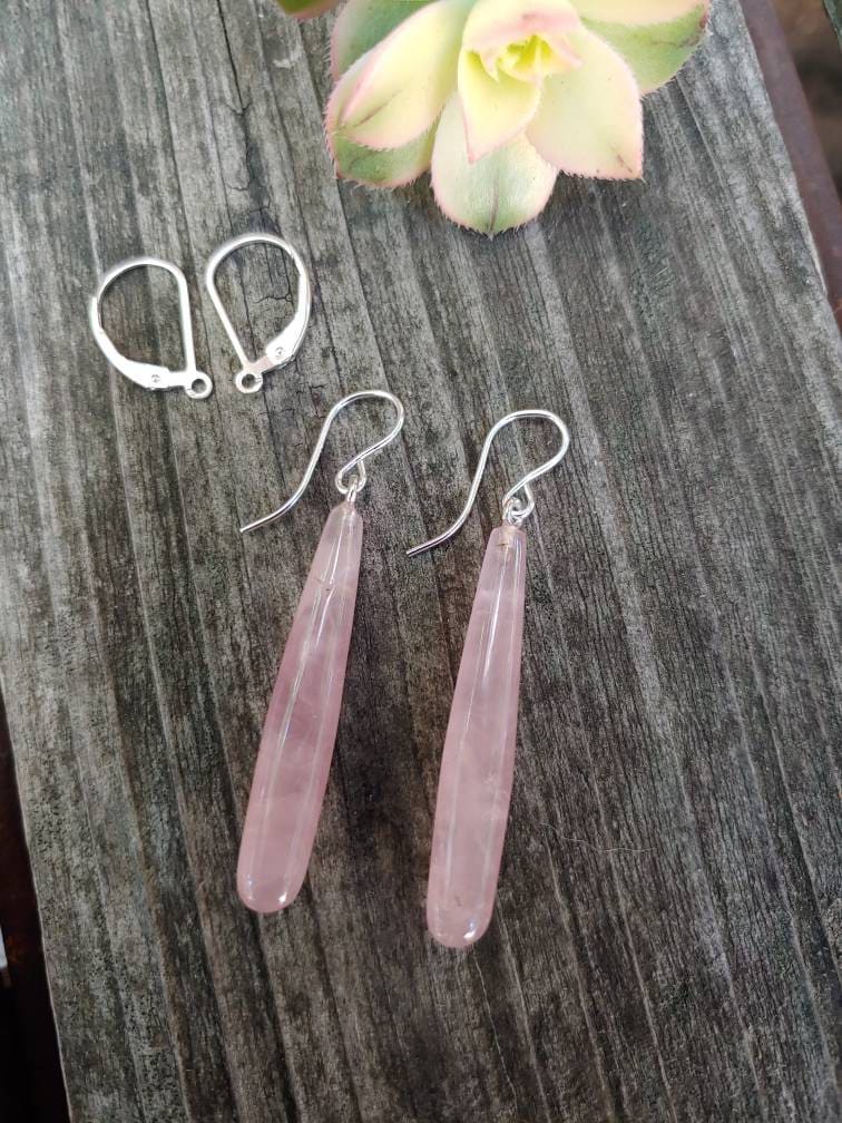 Dangle approx 2 inches from earlobe. These are smooth teardrop rose quartz gemstones