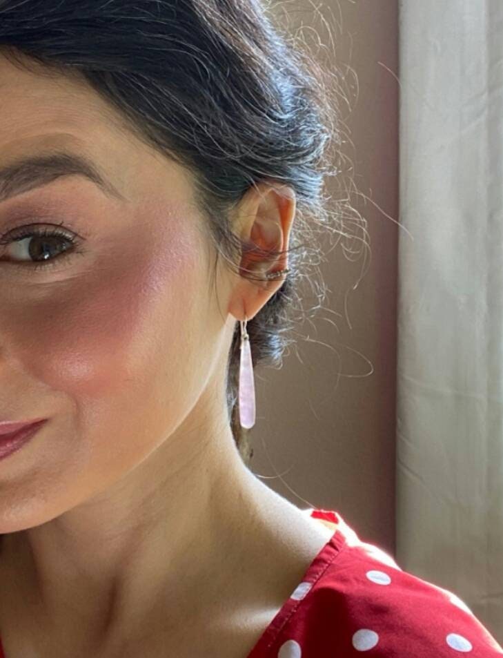 Long dangle drop rose quartz earrings. Available in Sterling silver only.