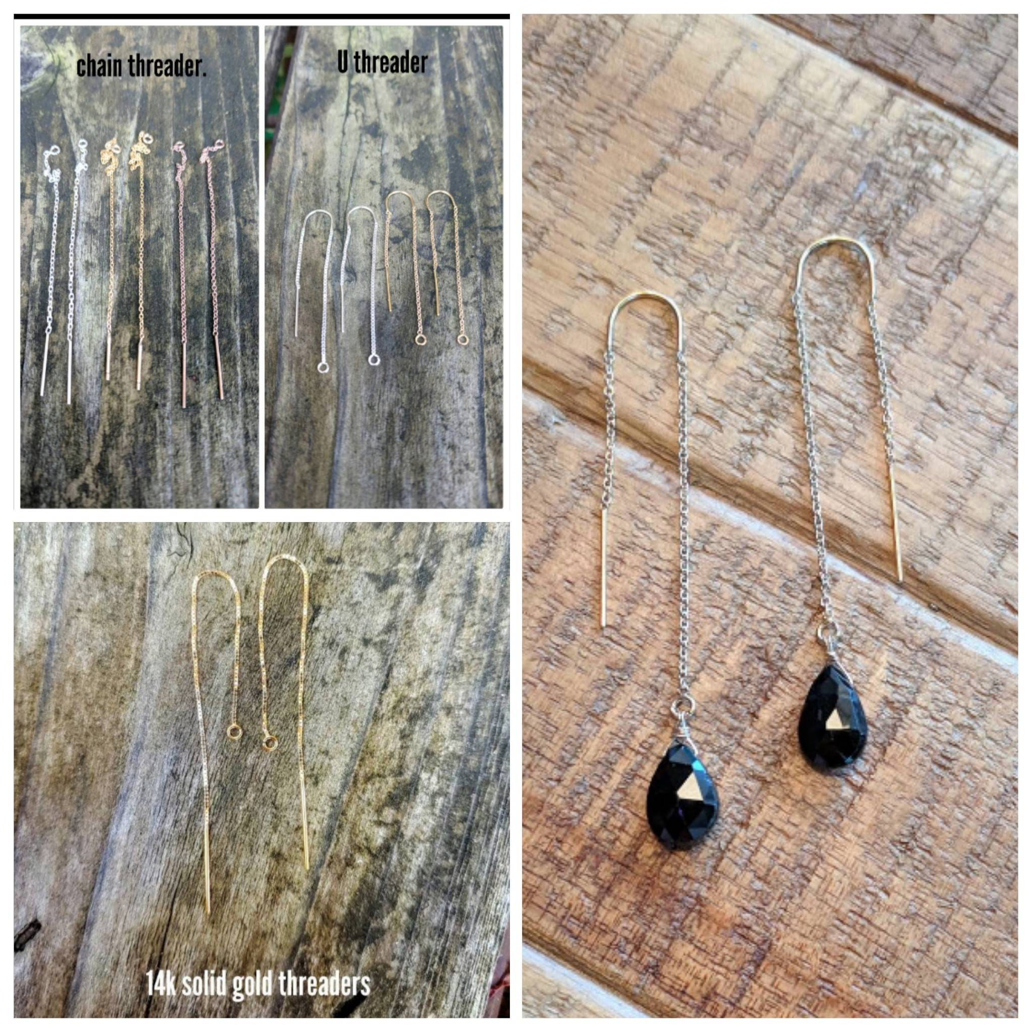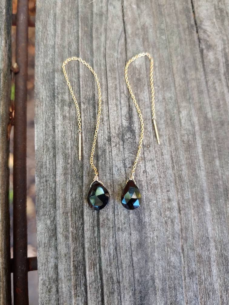 Long black tourmaline threader earrings. Available in sterling silver, 14k gold filled and rose gold filled.