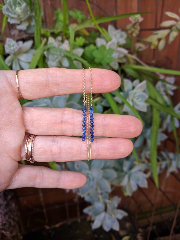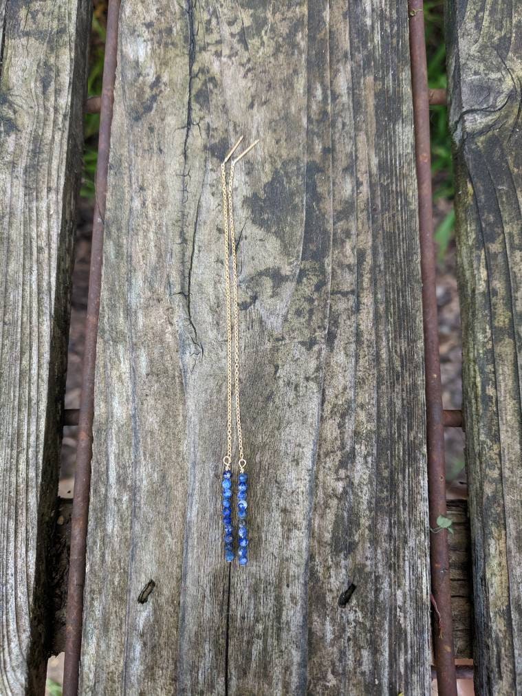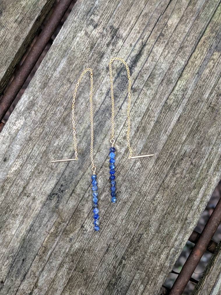 Long lapis threader earrings. Available in sterling silver, 14k gold filled and rose gold filled.