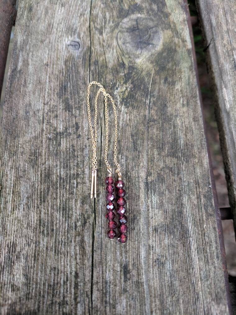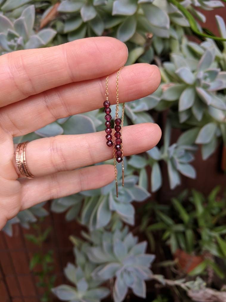 14k gold filled, rose gold filled, or sterling silver garnet threader earrings dangle approx 3 inches from earlobe.