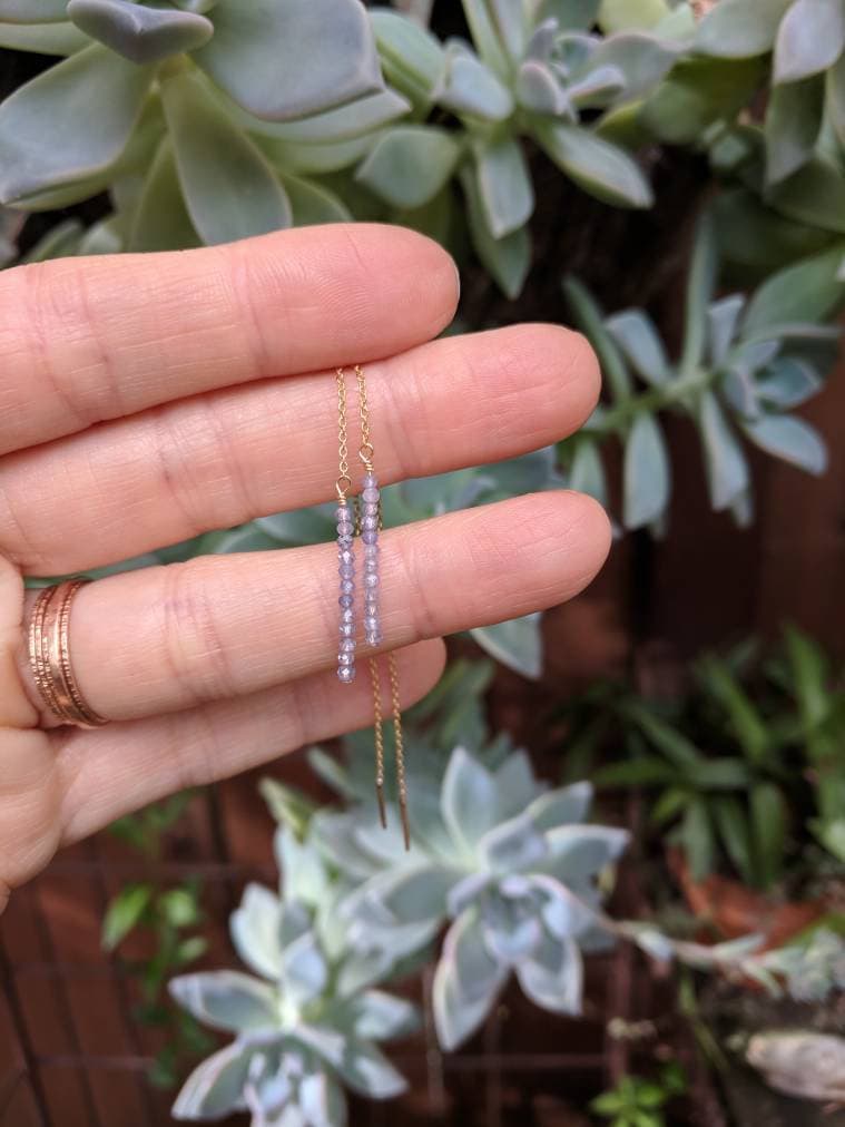 Long amethyst threader earrings. Dainty and sweet. These dangle approx 3 inches from lobe. Amethyst gemstones are faceted and AAA quality!