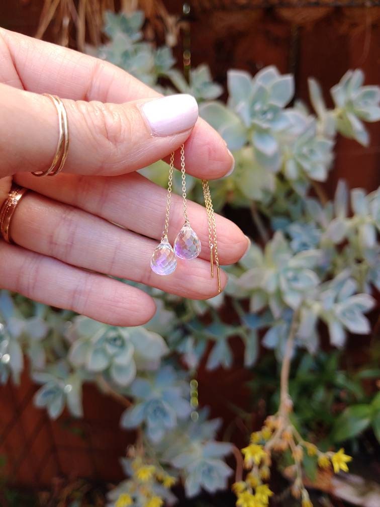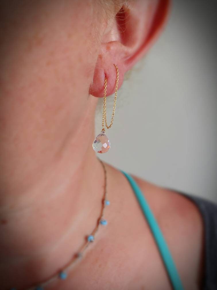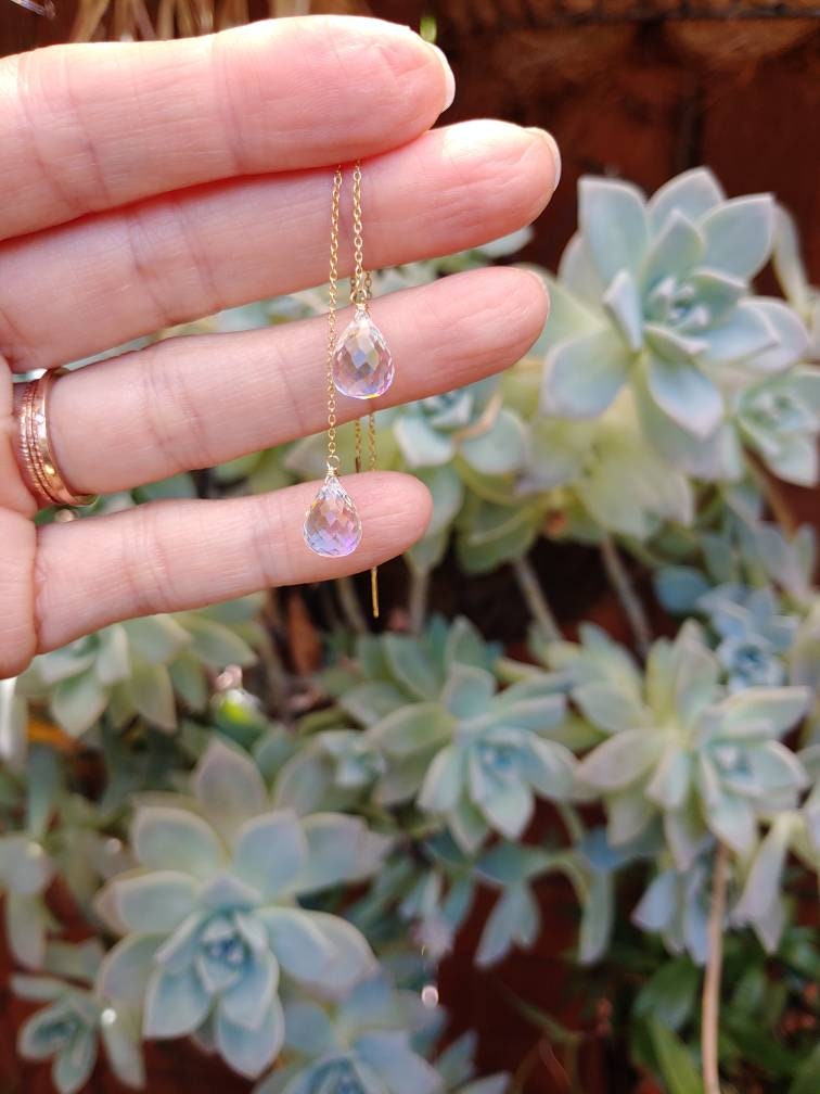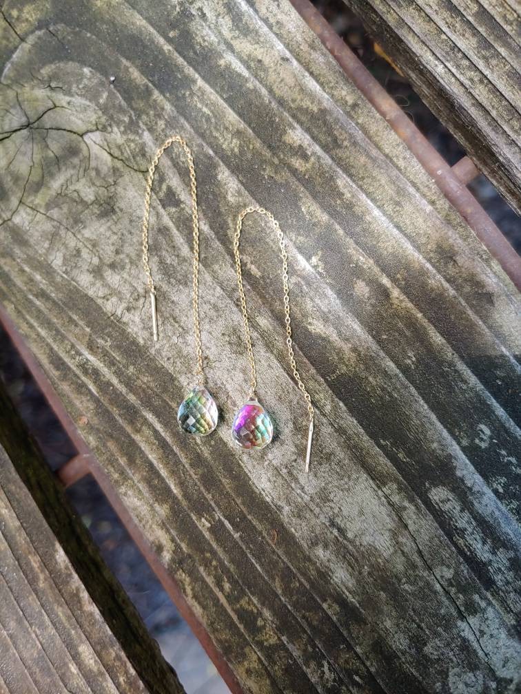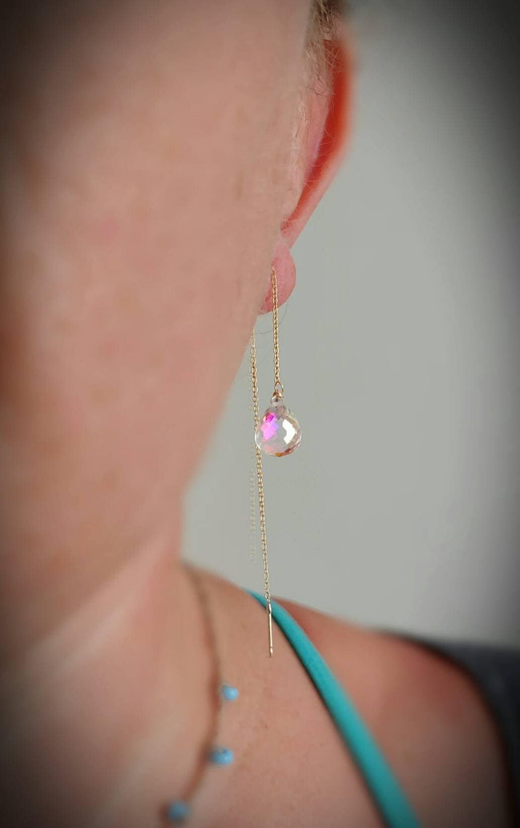 14k gold filled, rose gold filled, or sterling silver rainbow quartz threader earrings dangle approx 3 inches from earlobe.