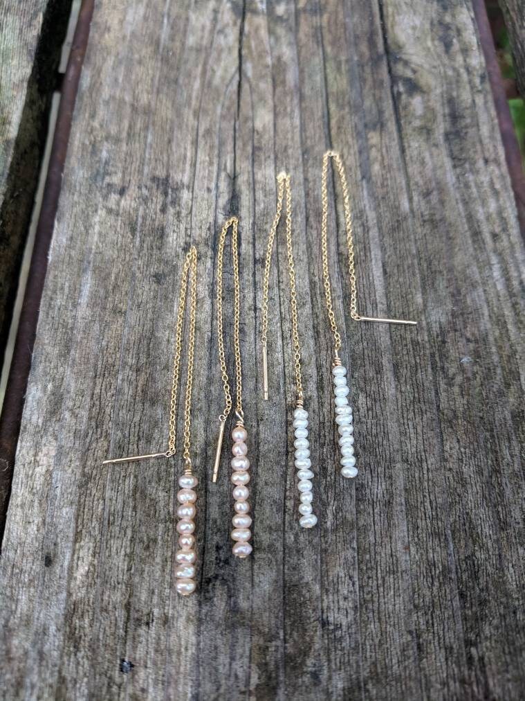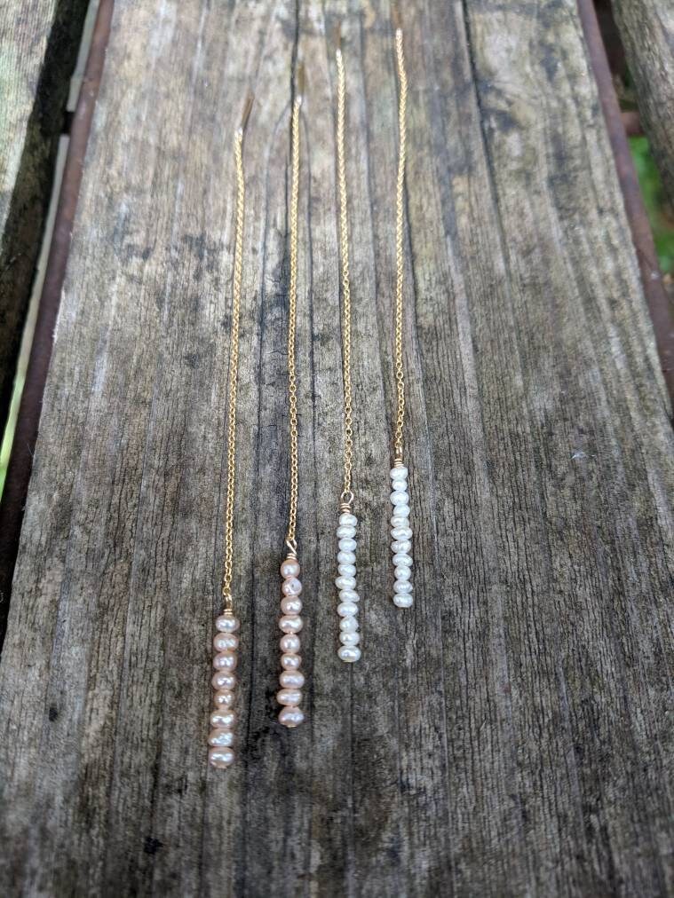 Long pearl threader earrings. Available in sterling silver, 14k gold filled and rose gold filled.