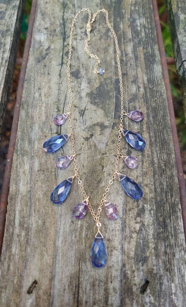 Elegance in sweet periwinkle and purple all wrapped up in this gorgeous necklace. These two colors together are amazing and truly dazzling! Faceted tanzanite quartz and amethyst gemstones dazzle in this piece!