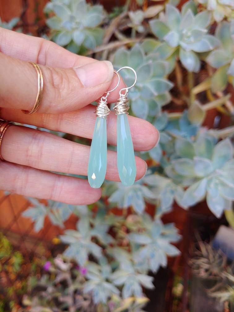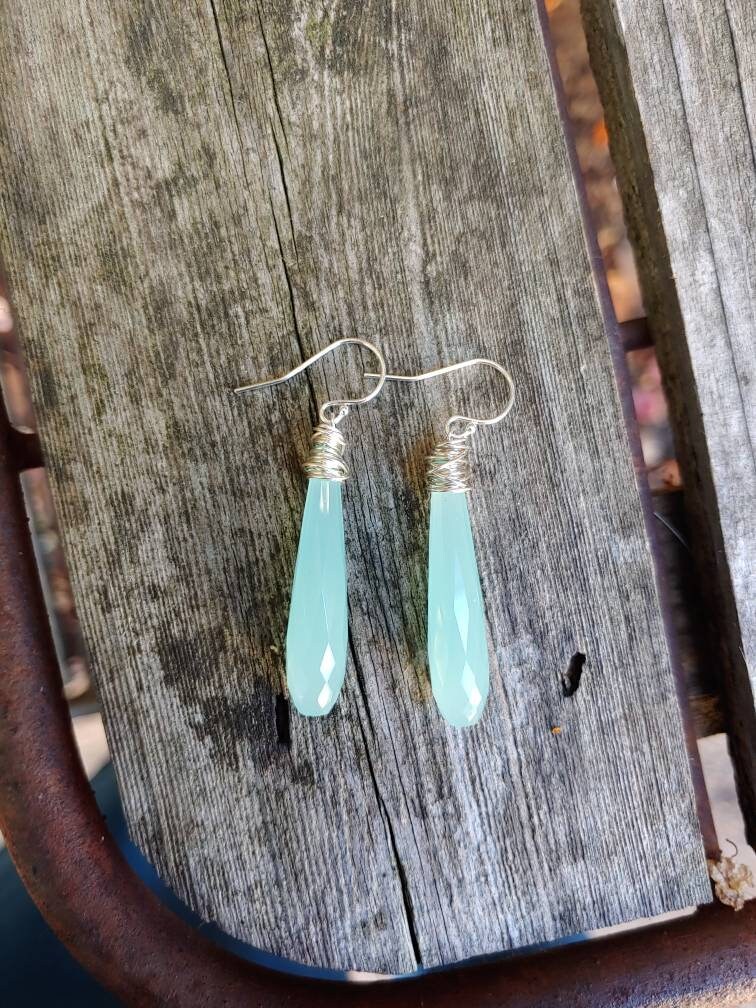 These elegant chalcedony earrings dangle approximately 2.5 inches from earlobe. These have wonderful baby blue hues that shows the quality of these gemstones.