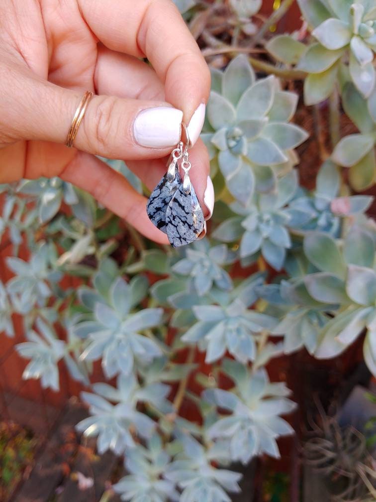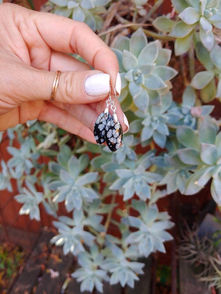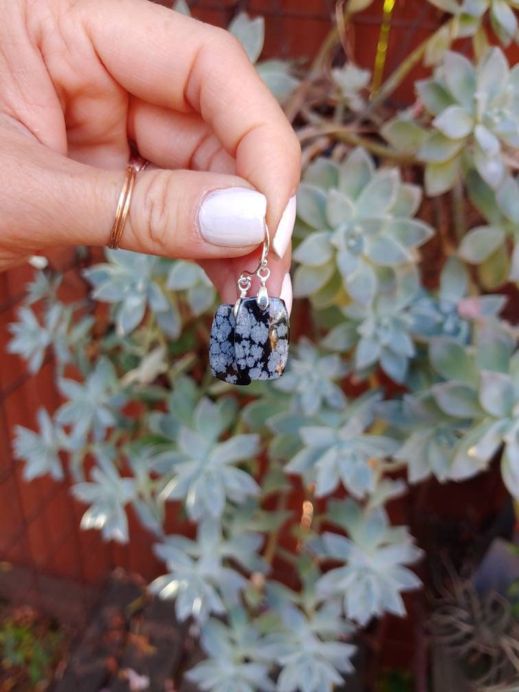 Beautiful snowflake obsidian earrings dangle approximately 1 inch from earlobe. Bold and sexy.