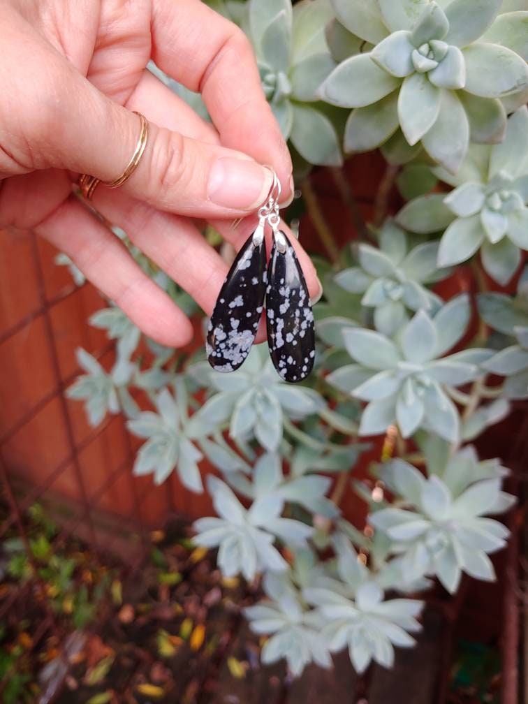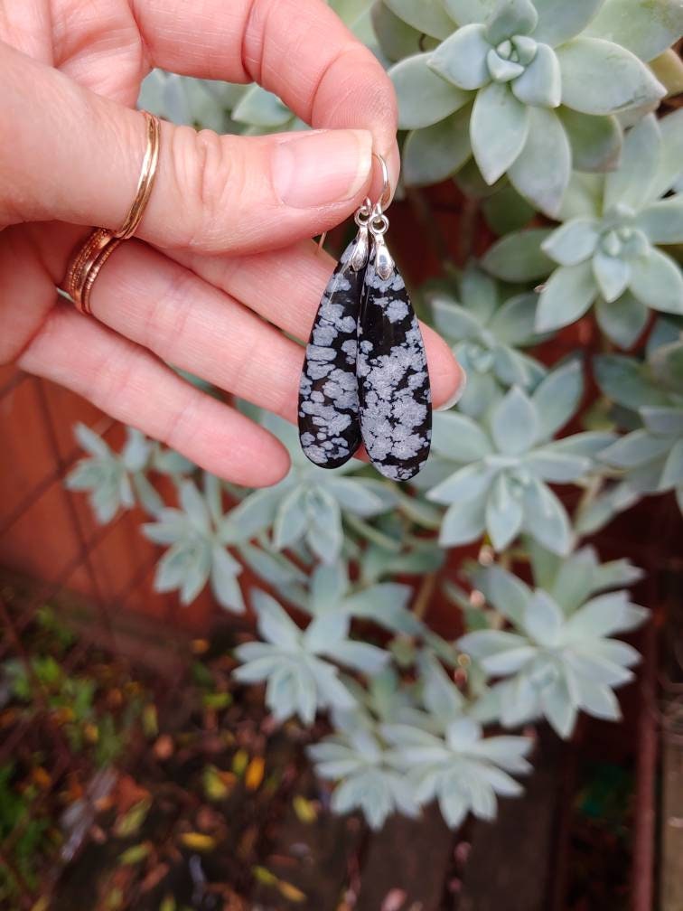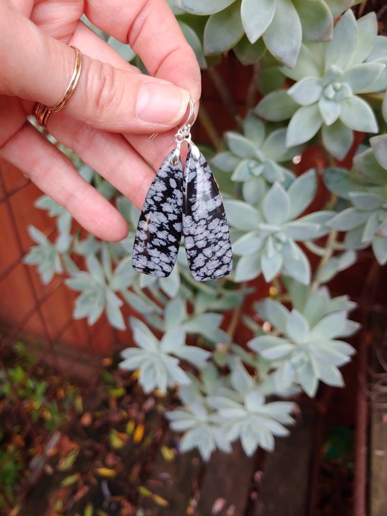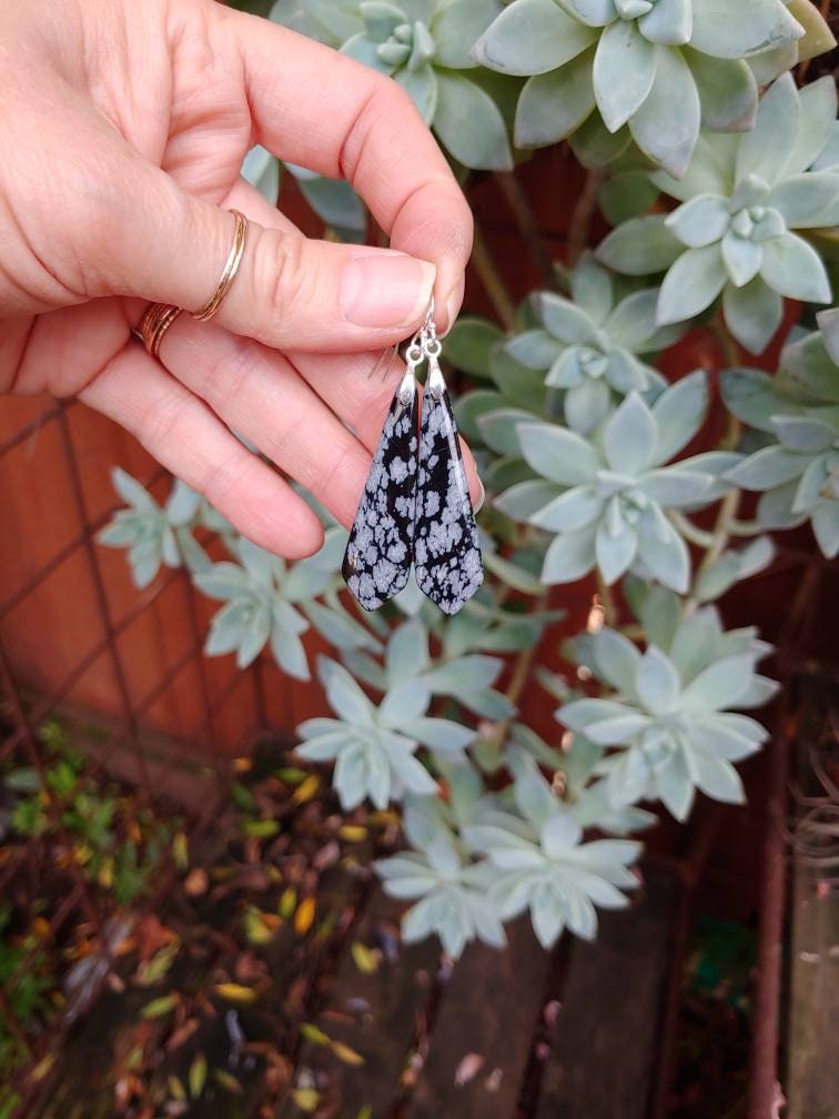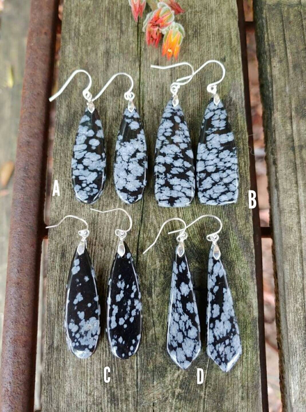 Beautiful snowflake obsidian earrings dangle approximately 2 inches from earlobe. Bold and sexy.