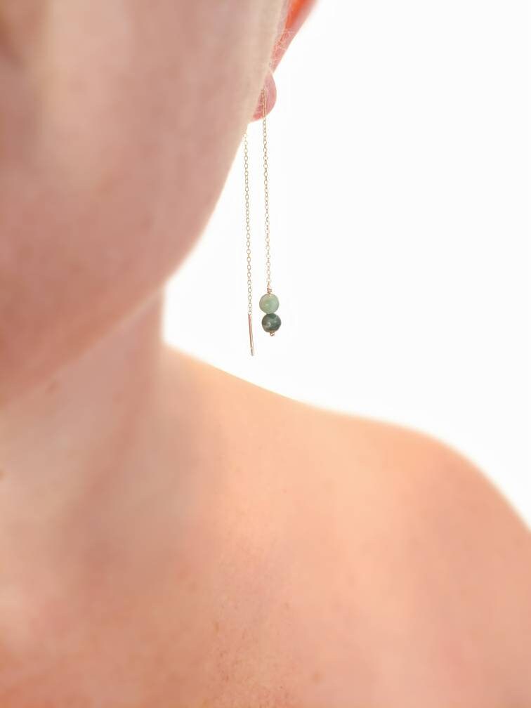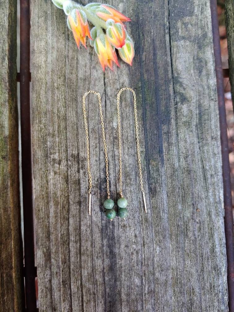 14k gold filled, rose gold filled, or sterling silver jade threader earrings dangle approx 3 inches from earlobe.