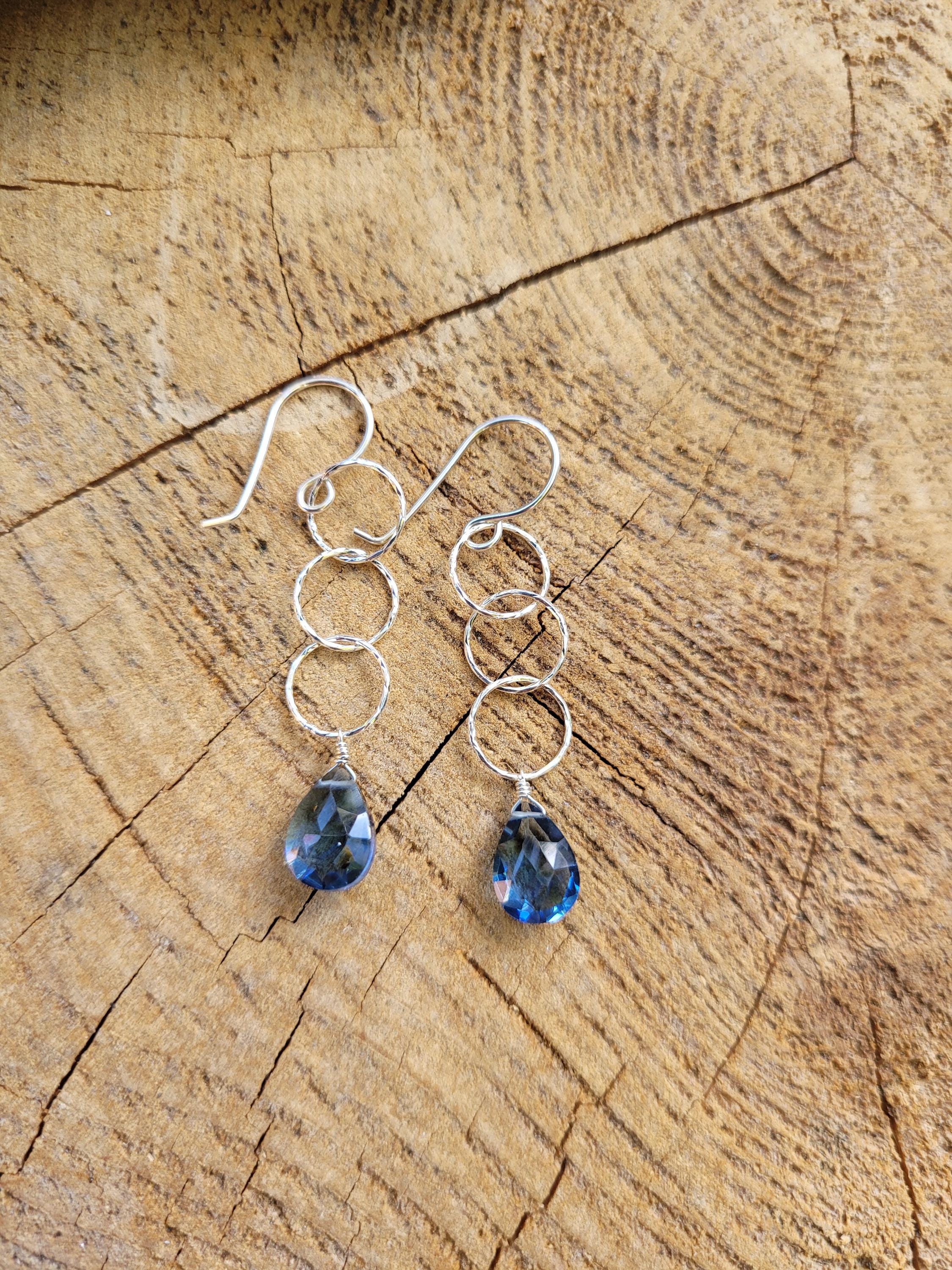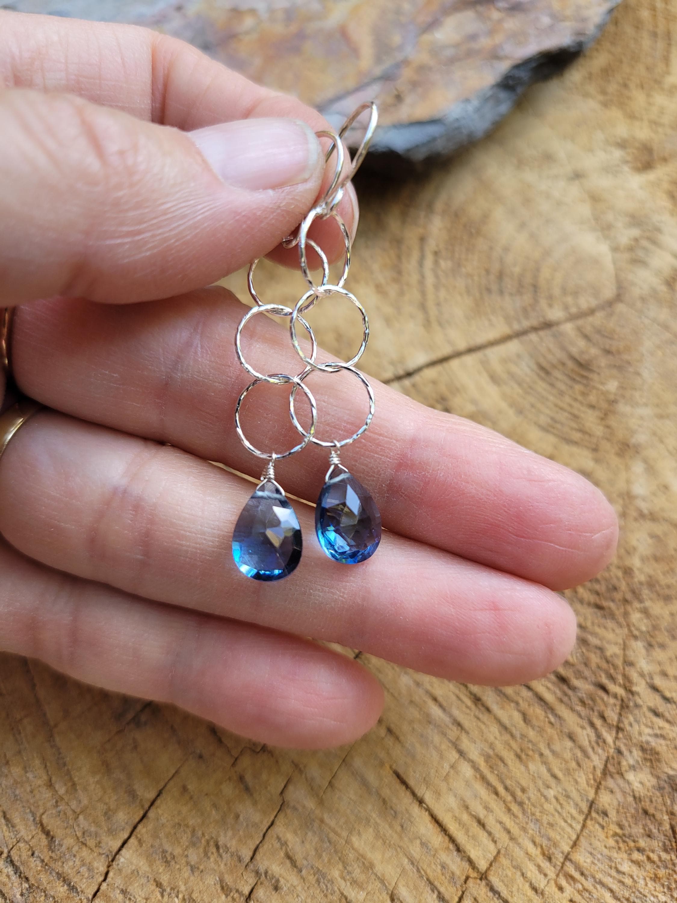 Dainty 3 ring london blue topaz quartz dangle approx 2.5 inches from earlobe. Avail in Sterling silver or gold filled. Want to modify these? Want longer or shorter? Less links?