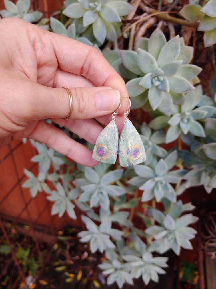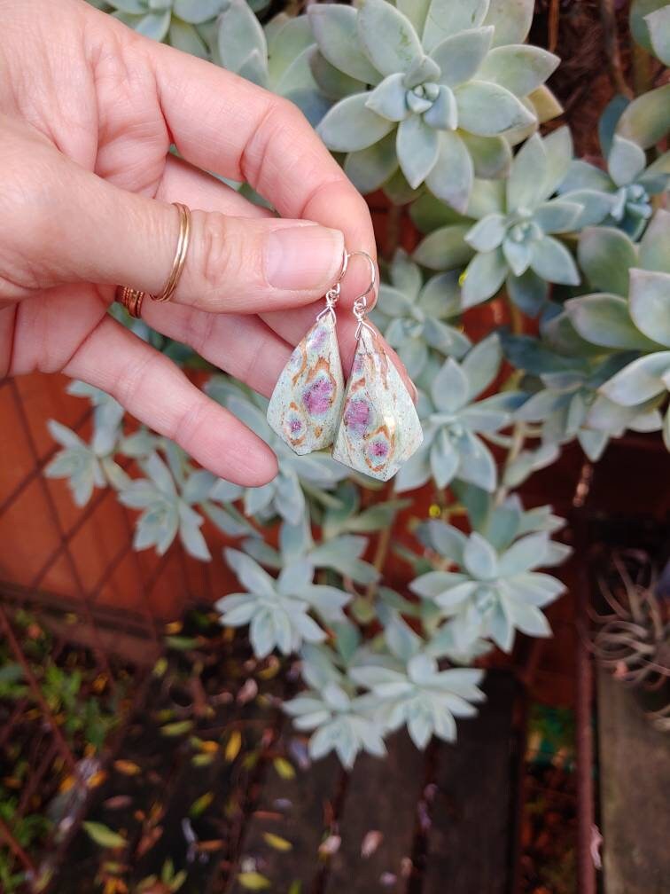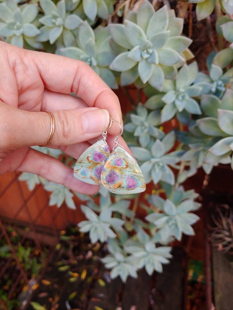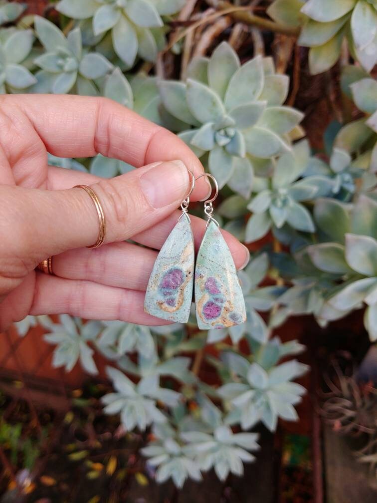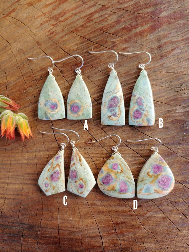 Unique cut of ruby in fuchsite earrings. These dangle 1 inch to 1.5 inches from earlobe. Elegant and fun at the same time. Colorful and radiant❤