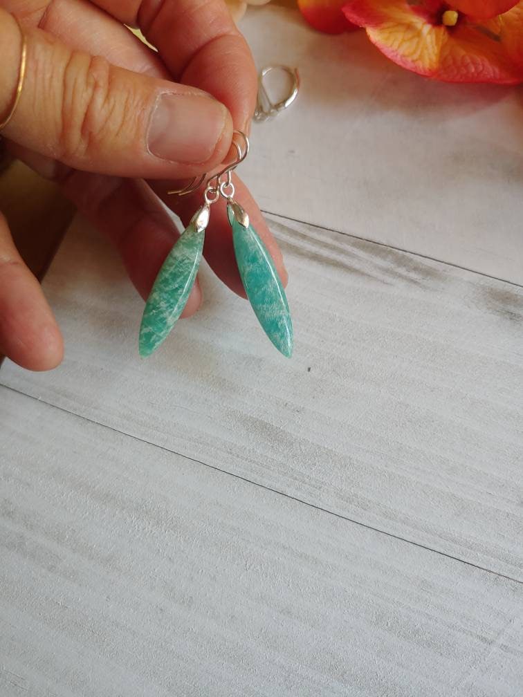 These amazing unique amazonite earrings dangle approximately 1.5 inches from earlobe. These have wonderful baby blue hues that shows the quality of these gemstones. ❤️