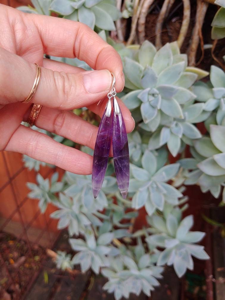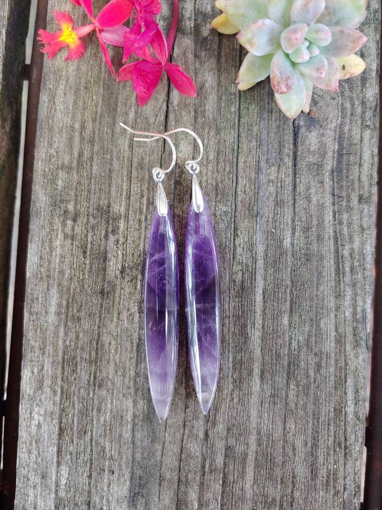 Beautiful amethyst earrings dangle approximately 2 inches from earlobe. These have wonderful purple hues that shows the quality of these gemstones.