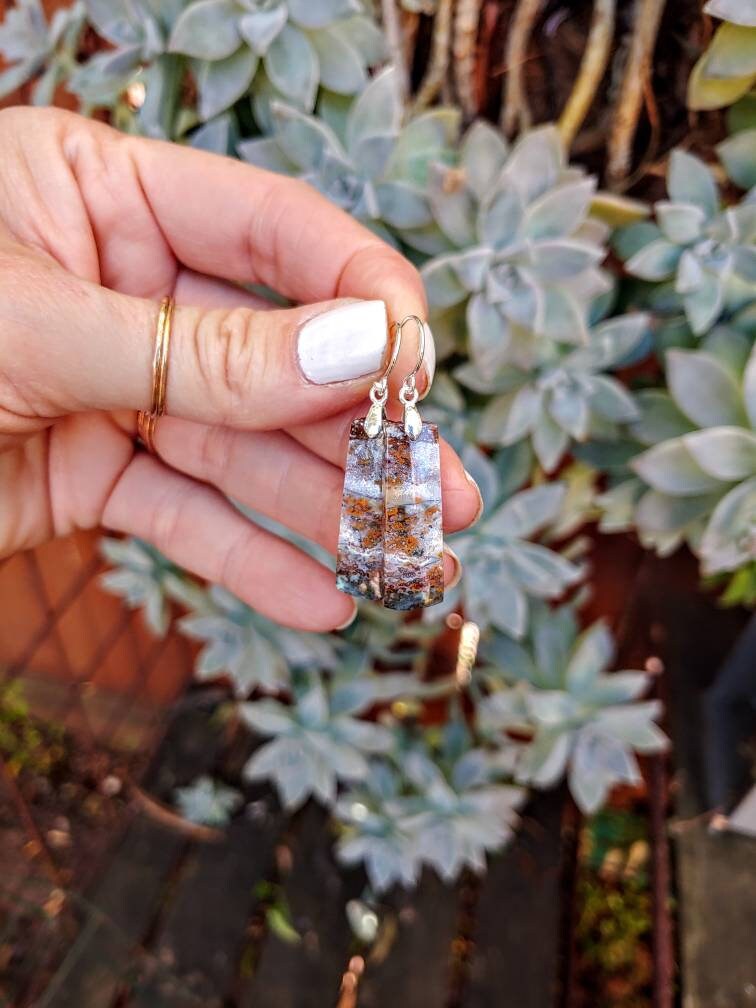 Unique opalized petrified wood gemstone earrings. These beauties dangle approx 1.5 inches from earlobe.