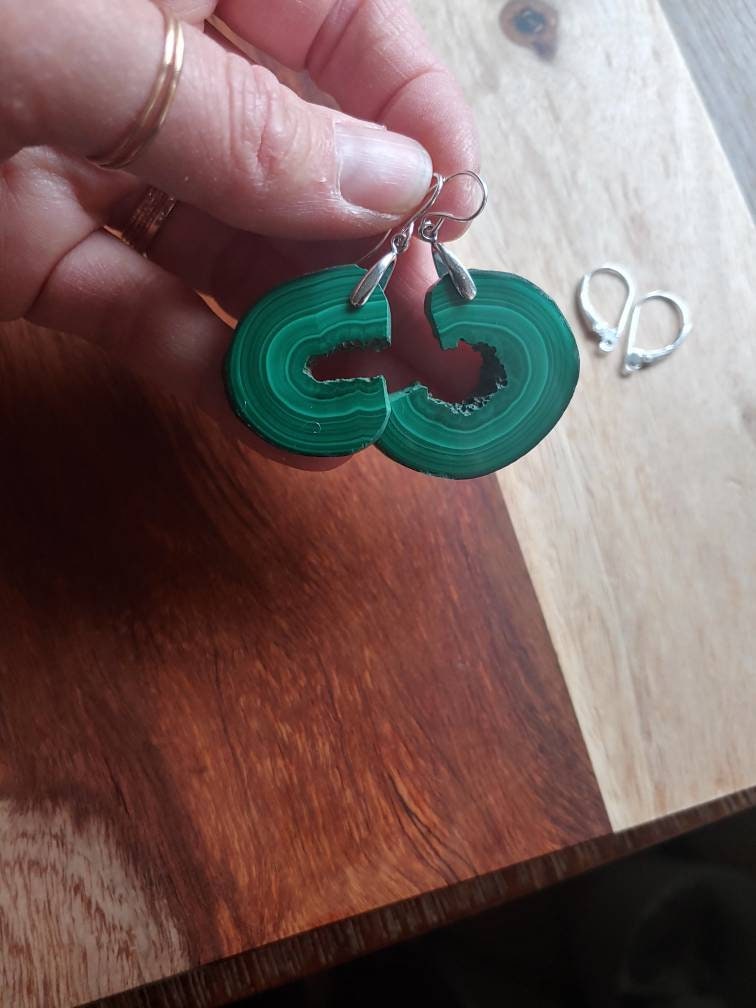 Gorgeous deep green and bright green hues of swirled rings in these malachite gems. These are in their rare natural form.