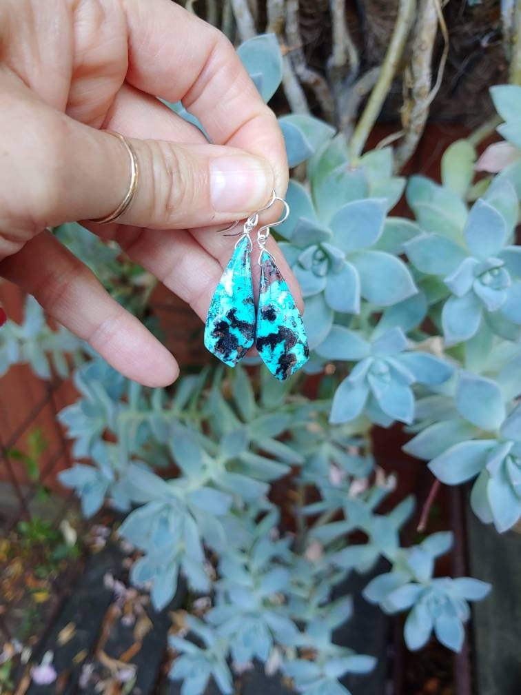 Unique azurite earrings. These dangle approx 1.5 inches from earlobe. Gorgeous swirls of dark and light blue hues in these earrings.