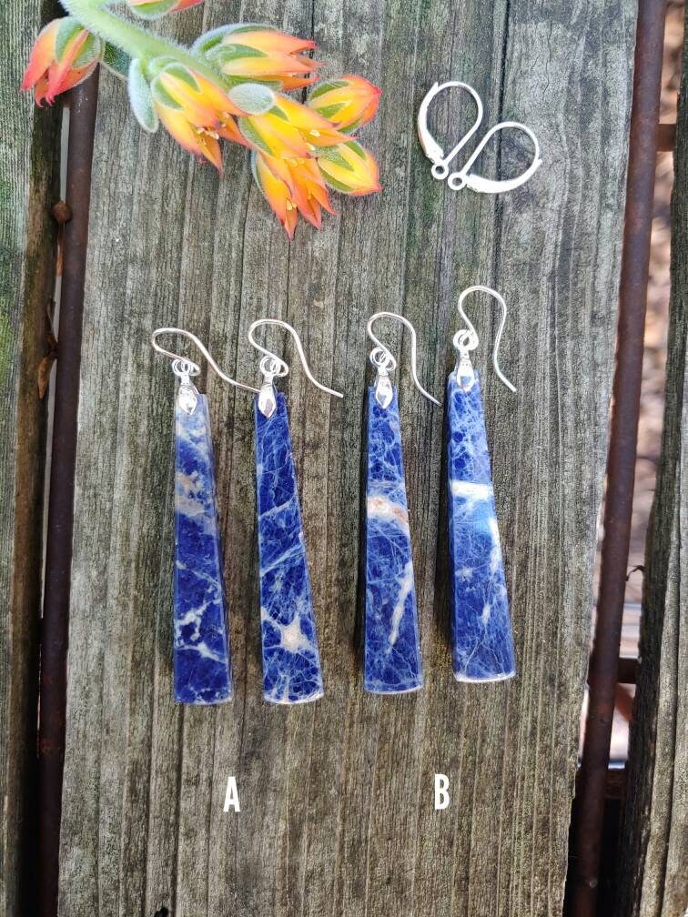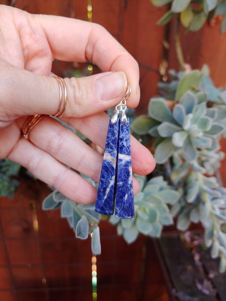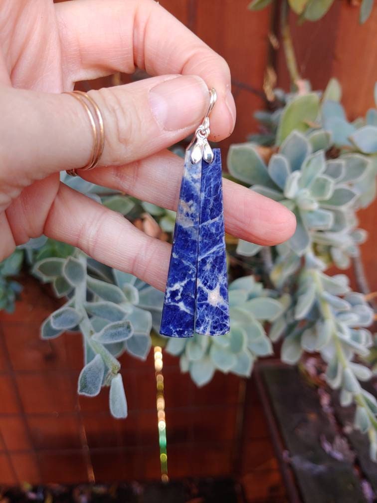 Beautiful natural sodalite earrings dangle approximately 3 inches from earlobe.