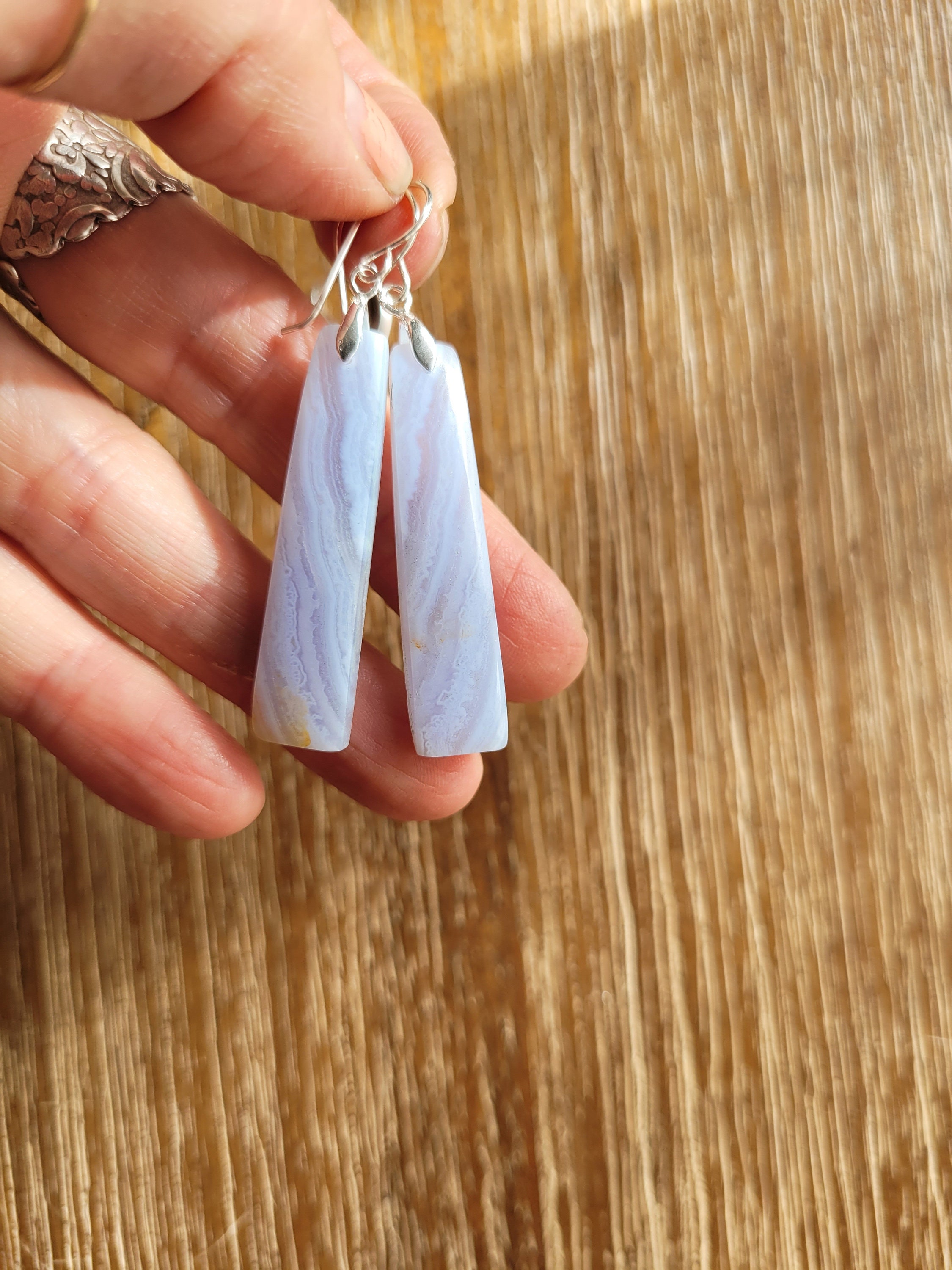 Soft and sweet baby blue hues in these long teardrop gemstone earrings.