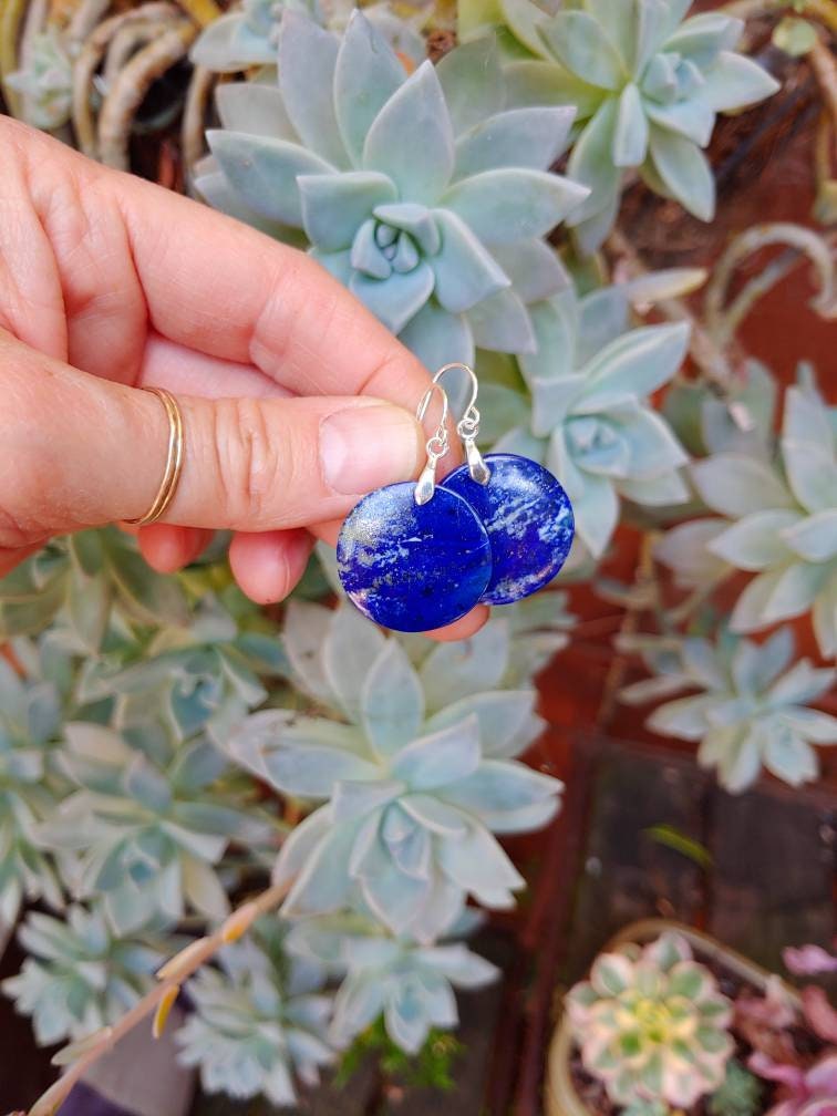 Beautiful lapis earrings dangle approximately 1.5 inches from earlobe. These have wonderful quality of blue and brassy pyrite hues that shows the quality of these gemstones.