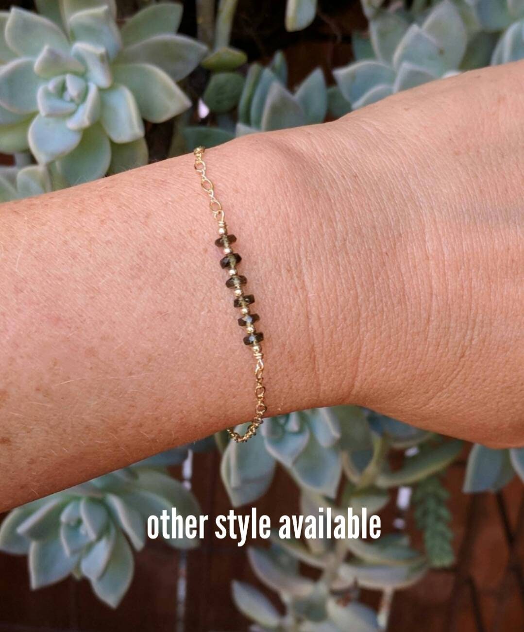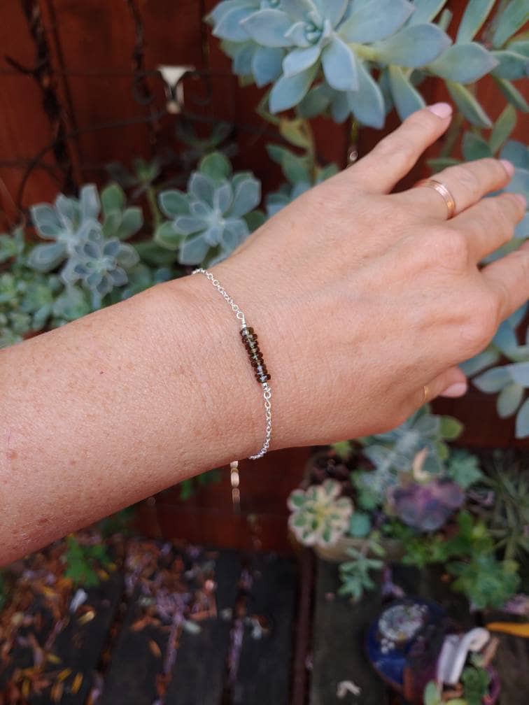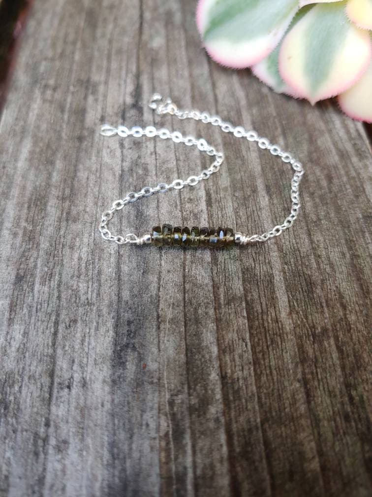 Dainty and unique moldavite bracelet comes in gold filled or sterling silver. 3x4 mm faceted tektite gemstones with gold (or silver) beads at the ends. Delicate and dainty bracelet.