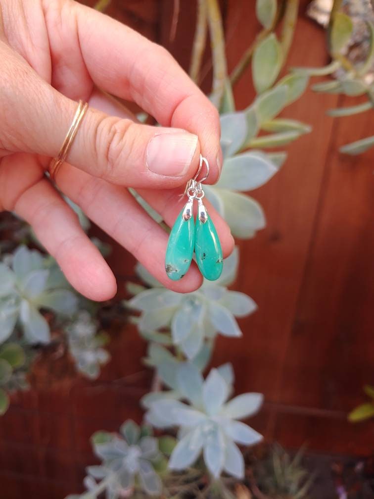 These unique teardrop chrysoprase earrings dangle approximately 2 inches from earlobe. These have wonderful sweet light green and blue hues that shows the quality of these gemstones. ❤️