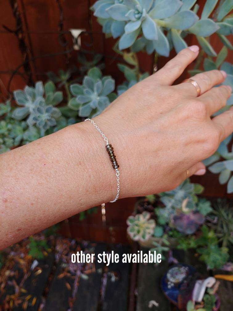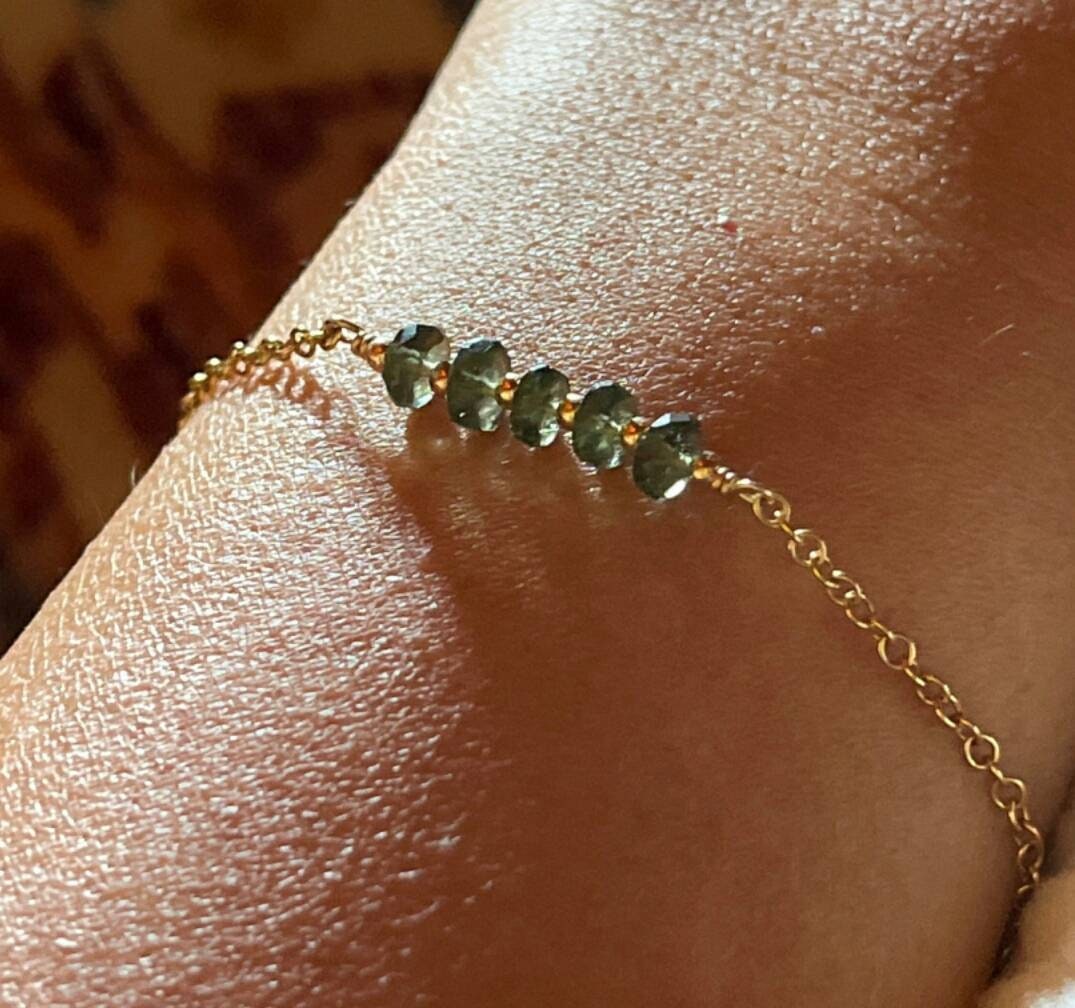 Dainty and unique moldavite bracelet comes in gold filled or sterling silver. 3x5 mm faceted tektite gemstones with gold (or silver) beads between. Delicate and dainty bracelet.