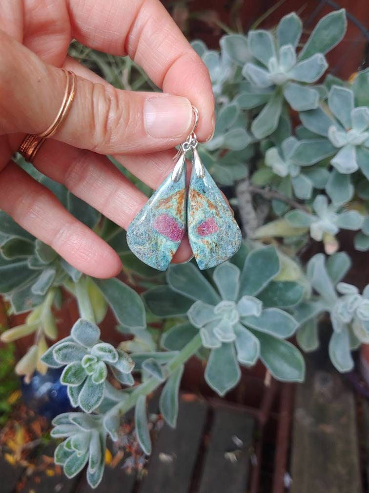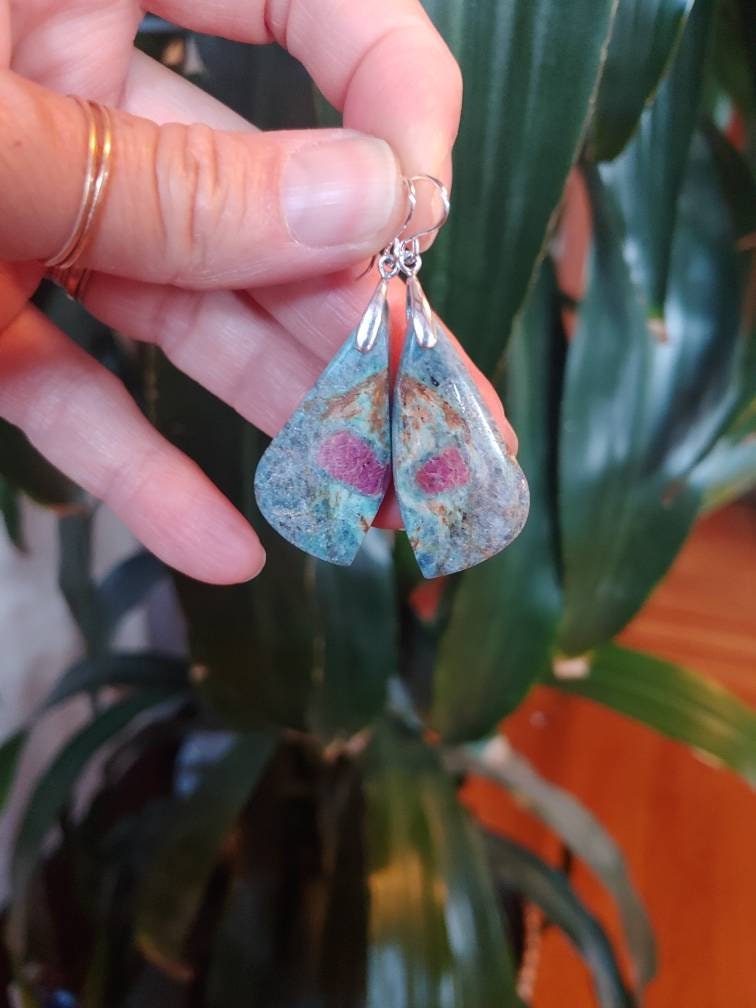Unique blue ruby in fuchsite earrings. These dangle almost 2 inches from earlobe. Elegant and fun at the same time. Colorful yet sweet with a little fit of funky❤