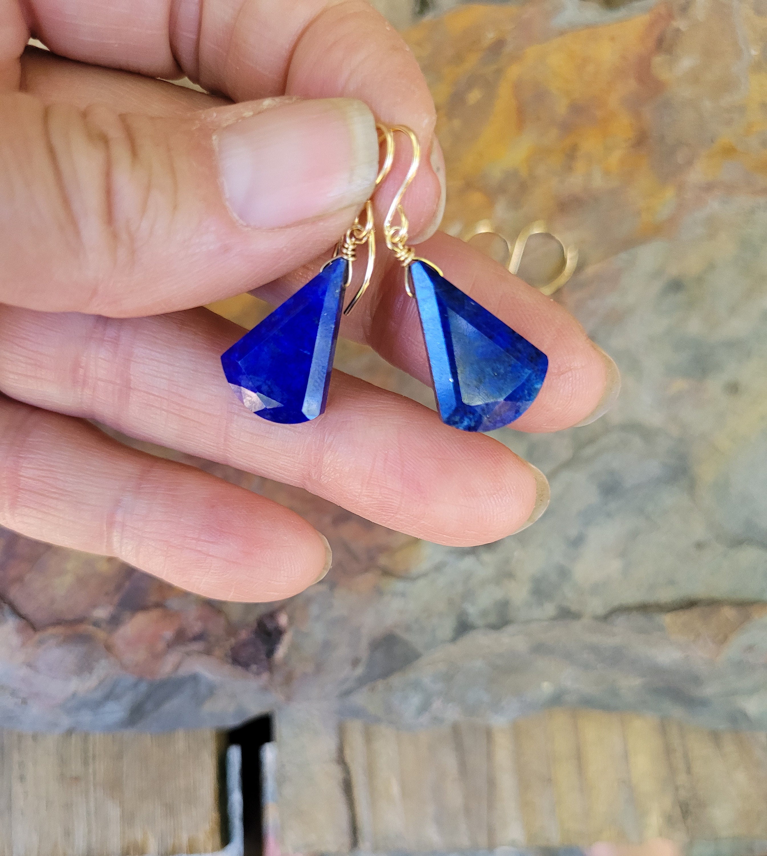 Beautiful faceted denim lapis earrings dangle approximately 1 inch from earlobe. These have wonderful quality of blue and brassy pyrite hues that shows the quality of these gemstones. Uniquely wrapped in a perfectly imperfect style wrap.