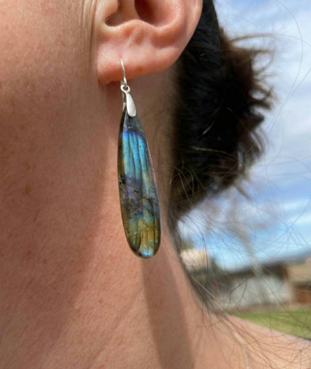 Labradorite gemstones dangle 2.5 inches from earlobe