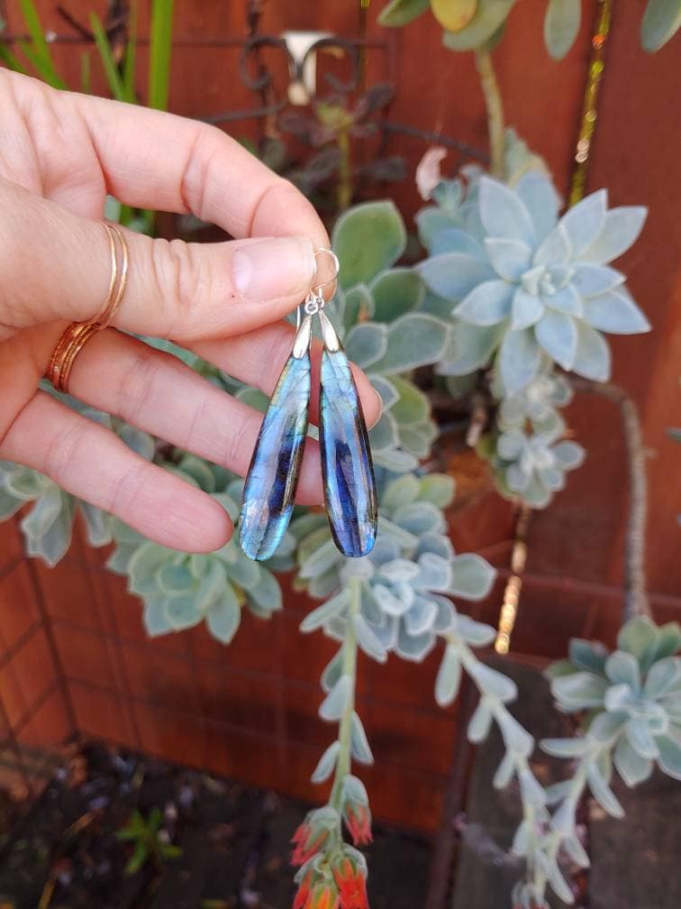 Long labradorite earrings comes in sterling silver only. Vibrant opalescent hues of labradorite is demure yet bold at the same time.
